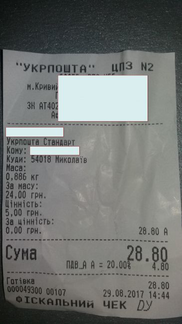 Посылка Стандарт 2.08 с весом 1430 обошлась в 24 грн (Кривой Рог - Черкассы)