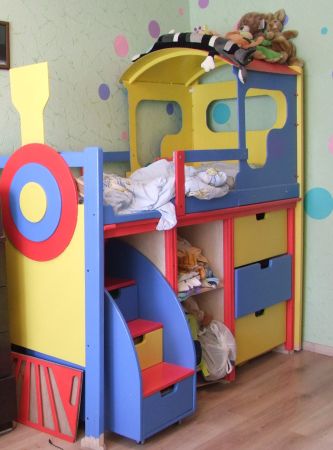 У нас кровать типа такой, как на рисунке автора, только ступеньки пошире, а внизу - диванчик для второго ребенка. Большой стол - напротив. Комната - 9 квадратов на двоих.