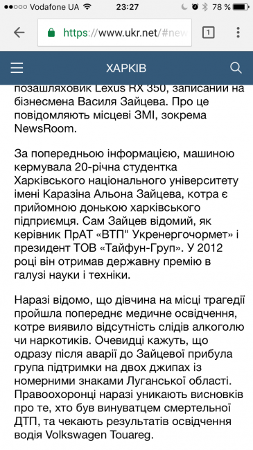 Уже ей сделали експерертизу и уже трезвая, а вот водителю Таурега никак экспертизу сделать не могут. Видать хотят повесить все на него. Не удивлюсь, если водитель Таурега ’вдруг’ окажется пян и виноват.