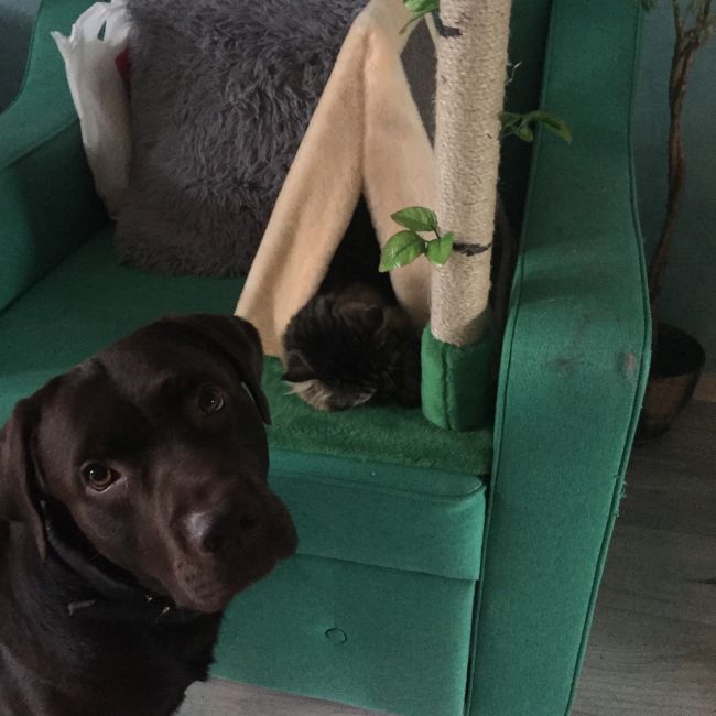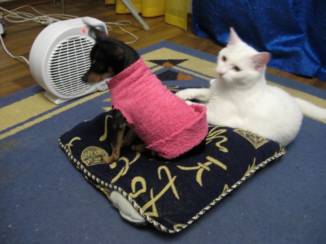 Той терьер мини, почти три года, Марго, весим 1.7кг. Кошка 7месяцев-4кг. Замерзли, греются под обогревателем