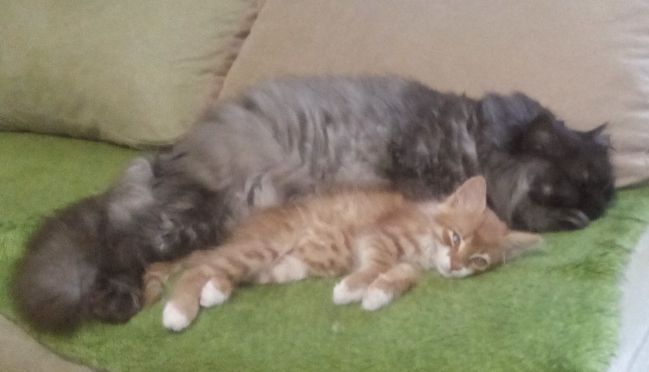 Малыш шустрый, совсем беспородный и невоспитанный. Иногда гадит где попало (воспитываем), иногда ходит в лоток. Отгоняет взрослого от миски, приходится кормить их или отдельно, или стоять над ними. Гоняется за взрослым, хочет с ним играть или видит в нем мамку и старается поближе к нему прижаться. Взрослый кот избегает общения с маленьким, но не обижает его.