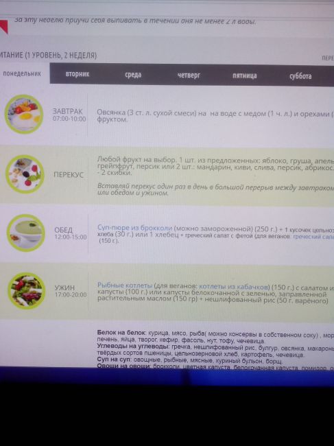 питание очень однообразное. были предложены рецепты. но для меня это было скорее издевательство. к примеру рецепт сырников - творог и белок 1 яйца. смешали и в духовку. ВСЕ. для меня это что угодно, но никак не сырники, про вкус я молчу
