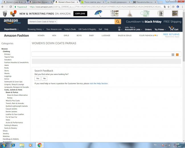 Уже несколько дней не получается пользоваться поиском на Амазоне США, ни по разделам товара, ни по марке. Вот решила написать. Прикрепляю скрин при попытке зайти в раздел женские куртки.