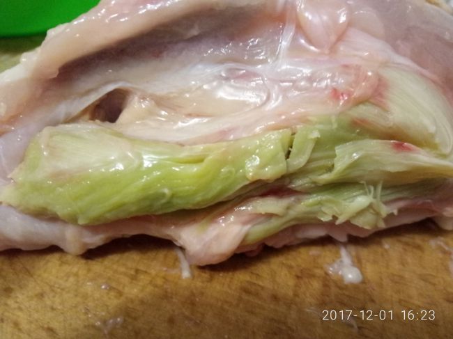 1. При неправильном забое птицы разлилась желчь.