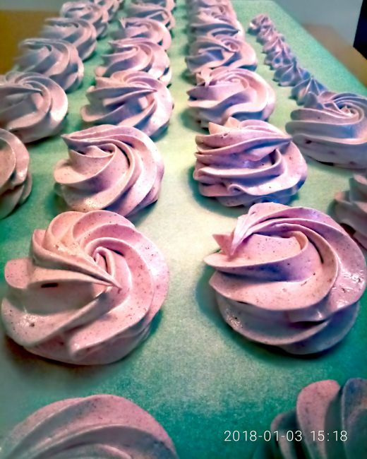 В цей час готуєте сироп. 200 гр цукру +80 мл води + 6 гр агара. Длвести до кипіння, варити 5 хв постійно помішуючи. Зняти з вогню і як тільки перестане кипіти поступово додати в фруктову суміш. Все разом збивати ще 5 хв. Має вийти пухка маса. Кондитерським мішком відсаджуєте на пергамент. Швидко, бо почне застигати по мірі охолодження. Все. Залишаєте сушитись від 12 до 20 годин. Потім притрушуєте пудрою і з´єднуєте половинки.