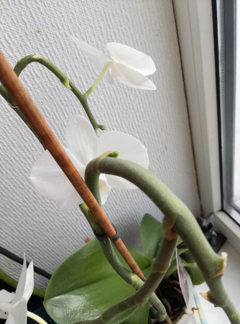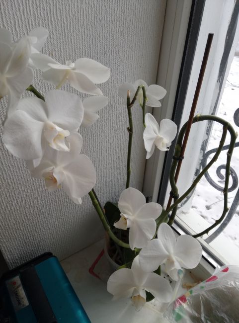 Вот у меня белый, был куплен с одним цветоносом отцвевшим(в уценке, жаль стало его, даже листья утратили тугор, были мягкими, но хорошая корневая, как у Вашего). За два сезона нарастил дополнительно 2 ветки еще и еще , цветет по пол года. А розовый(сорт Вена, мелкие цветочки)отцветет , умрет у него цветонос, так каждый раз, но цветет букетиком.