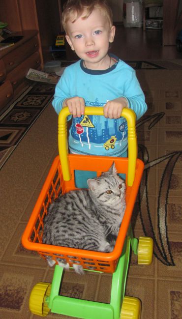 Вот наш). Детям позволяет делать с ним все, что угодно. Они его даже лечат - пациент на столе - что хотите то и делайте). Но как писала выше на руках держать, носить не дай Бог - крик и вырывается. В тележке игрушечной мог долго быть - возите меня, возите))). Фотки - там он еще маленький до года). Это кот. Говорят, что кошки более ласковые.