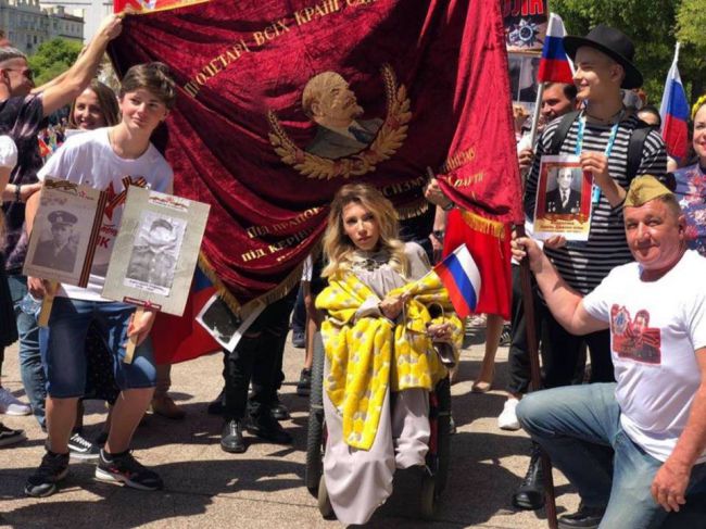 То вы ещё не видели ее фото деды воевали и флагом с Володе ульяновым
