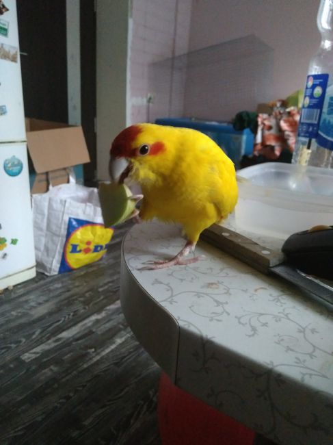 Теперь птица у меня,корм не совсем есть,только фрукты.Вчера целый день летал по квартире,словить нельзя-только в темноте!