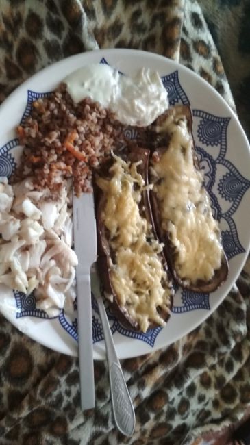 Последнее фото это мой обед на спец.питании: рыбка запечённая,гречка и диетический жульен в лодочках из баклажан. И пару ложек огуречного соуса с йогуртом.