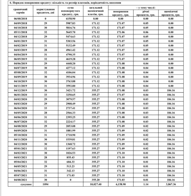 Прийшов товар на нову пошту. Договір на 36 місяців. Тіло кредиту 6200 + 15 місяців безпроцентів інші 15 з процентами 180 грн./за місяць одних процентів.