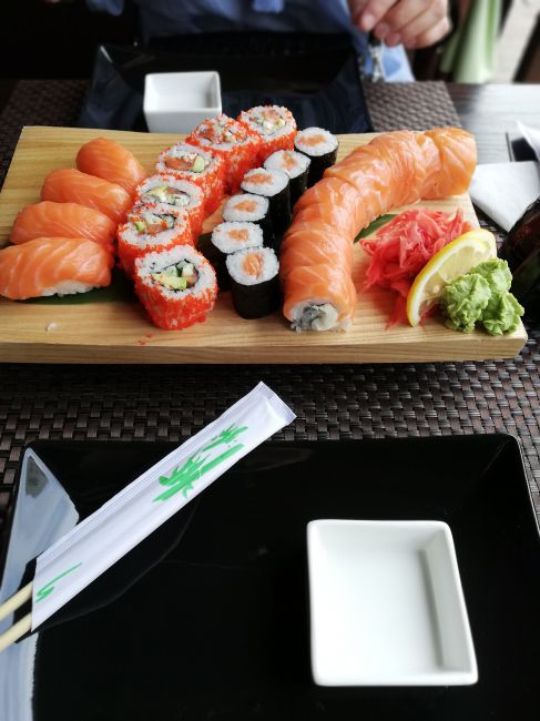 а на обед сегодня был стейк или норвержского лосося, половинка авокадо, огурец и немного цветной капусты на пару
