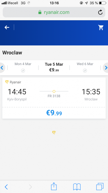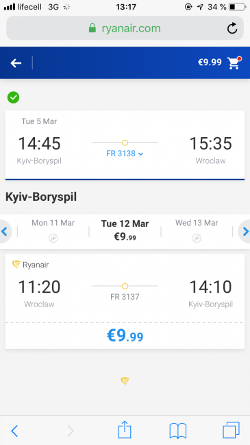 НА сайте ryanair. Пример киев вроцлав киев. Нужно ловить цену, Как Только открыли продажи все по Польше были рейсы за 9,99 евро, сейчас что осталось. Пример