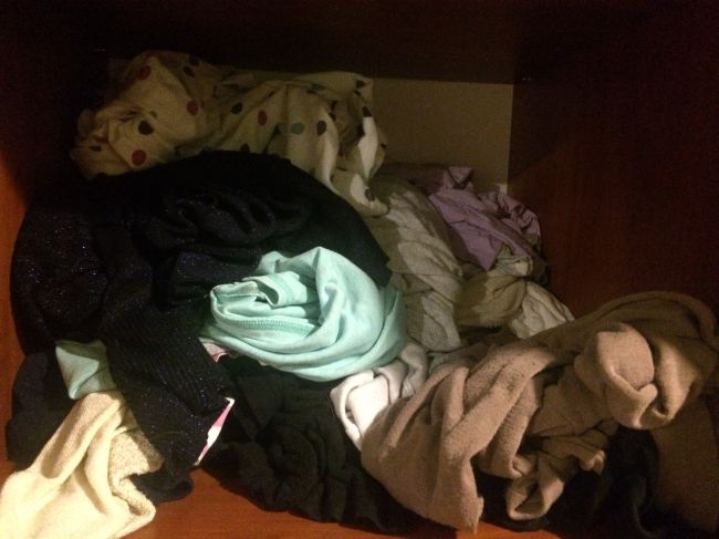 Это мои полки в шкафу. Выше полки мужа. Там повеселее. У детей другой шкаф, вещей куча))