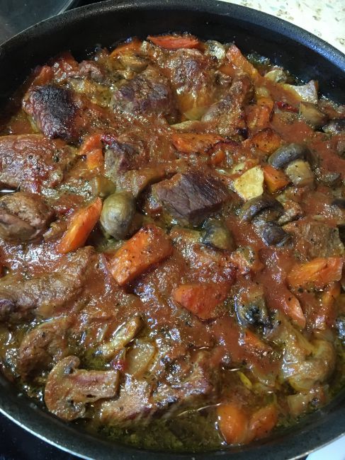 То , что во втором посте - говядина тушёная в красном вине и потом запечённая с грибами и овощами в томатном соусе. Муж просит мяса.