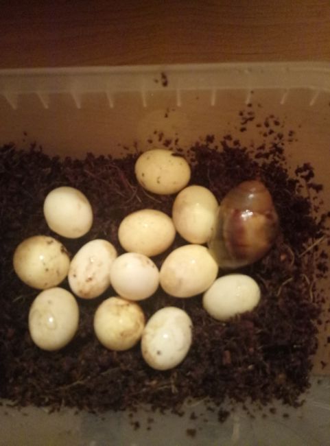 А я вот удивилась размеру яиц... У знакомых это выглядело как крупная икра, как кучка гороха в углу террариума. А у нас с десяток яиц крупных, зарытых в грунт. Оболочка твердая, как у обычных яиц. И даже узор на скорлупе есть.