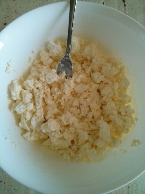 На полкило творога (желательно домашнего). Беру всегда не жирный (жирный домашний просто плавится на сковороде)