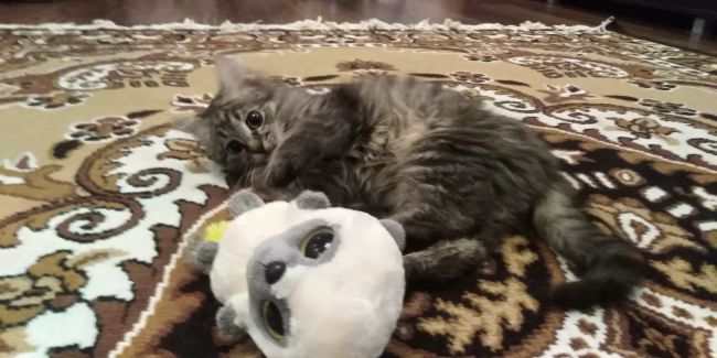 . В зубах носит мячики, волочит за собой мягкую игрушку, сейчас принёс мочалку, играется. Ему идеально подойдёт семья где уже есть кошка или собака, или семья где постоянно кто-то дома, потому что за день он один наскучается, а потом бегает по головам)))