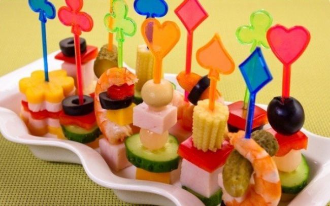 в дітей стільки не влізе, залиште піцу, роли і тортик. І орієнтуватися треба на смаки друзів, а не свої - більшість дітей такого не люблять