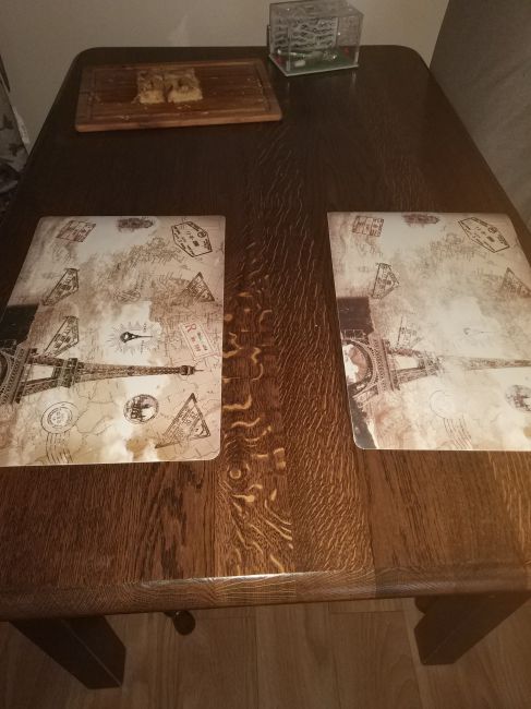 Стол дерево .Всегда застилаю его .Купила 3 льяные скатерти на Розетки (Оршанский ленкомбинат -Беларусия).ещё хочу жокард попробовать .мне нра .красиво .Со скатертями лучше чем без .На столе ещё стоят круглые плетённые круги ,диаметром 40 с .под тарелки .Скатерть меньше пачкается
