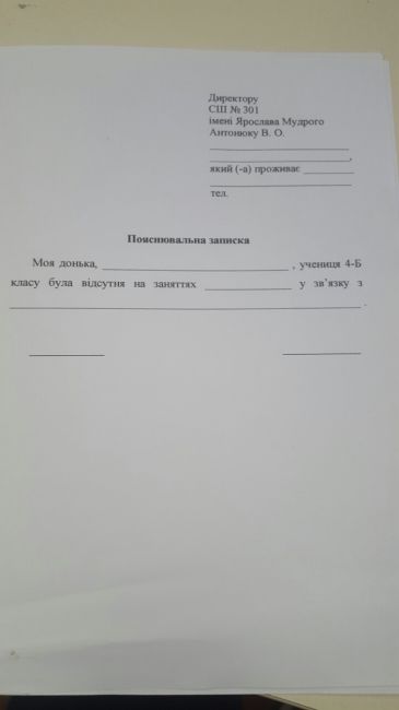 На директора у вільній формі,хоча я надрукувала для всього класу,лише вказати причину та фіо
