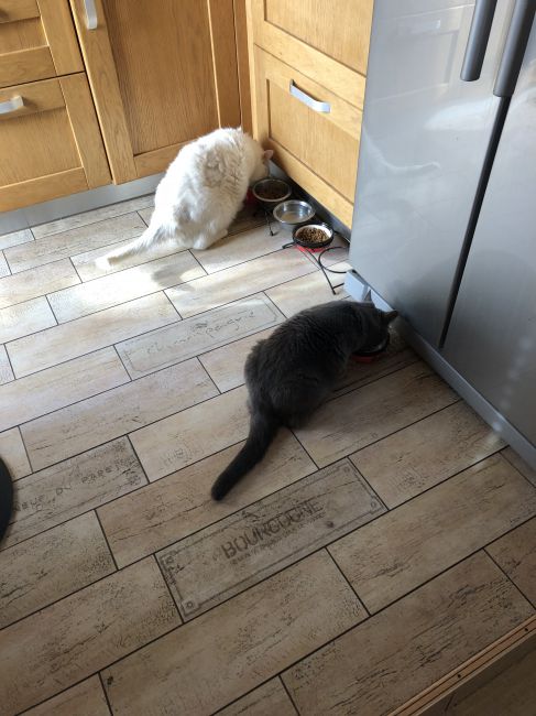 Ночь вообще спокойно, белый с нами наверху, мося внизу спит. Сейчас начали адаптацию, чтобы ели вместе), поэтому немного миска отодвинута, он стесняется.