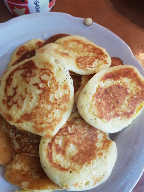 100 г муки, 200 мл кефира, 1яйцо, щепотка соли. Подсластить при желаниии. Пеку на сковороде с каплей любого масла (у меня арахисовое, кокос или оливковое). 1 ложка теста =1 панкейк.