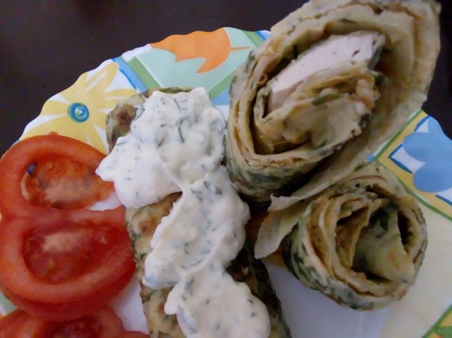 Соус - сметана,чеснок и укроп и свежий помидор.