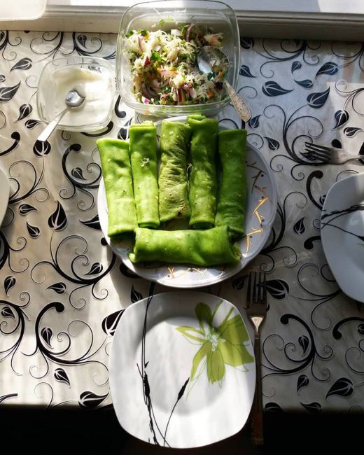 вот мои шпинатные блины, внутри творог с зеленью, шпинат всегда на блендер, если просто измельчить - так омлет со шпинатом больше получается