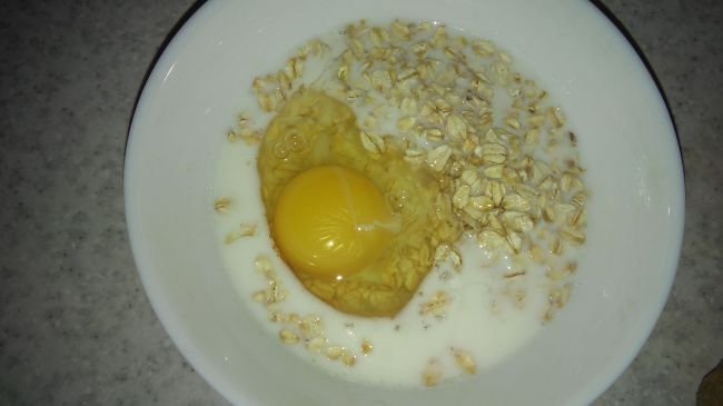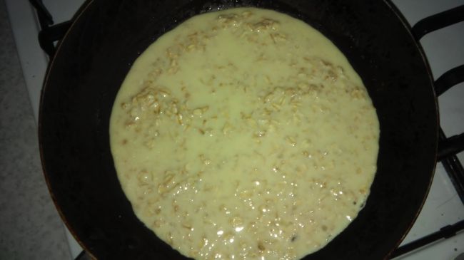 3 ст ложки овсяных хлопье( можно измельчить, можно цельными), 3 ст ложки молока, 1 яйцо, все это перемешать вилкой и дать постоять минут 10. Сковорода у меня 26, можно и на 24, но будет более толстый, разогреть, на сухую или смазать каплей масла выложить эту смесь и разровнять , можно накрыть крышкой, он более нежный тогда. Когда схватился( минут 5-7), перевернуть на другую сторону. Это сам блин, в него можно положить любую начинку по вкусу. Фото подруге пересылала( худею ее)))