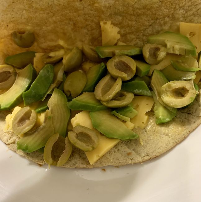 Овсяноблин с сыром,маслом,авокадо и оливками.