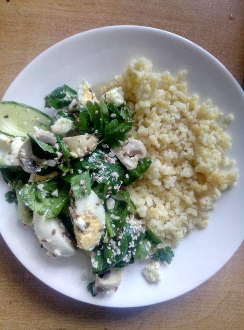 Дико люблю такой конструкт. Полезно и быстро. Булгур без соли запариваю кипятком на полчаса утром. В салат - много шпината, если есть - то руккола или айсберг, яйцо четвертануть, сырые шампиньоны или отварную рыбу, или мясо, иногда огурец. Много зерен льна и кунжута и цитрусовый топпинг... Времени минимум, пользы максимум.