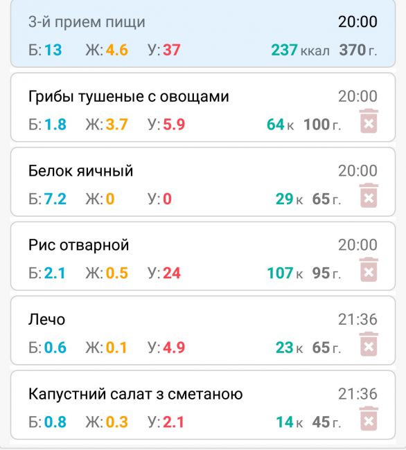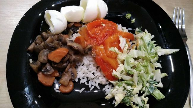 Теперь готова обсудить свой ПП ужин - вареный рис, тушеные с овощами грибы, яичные белки и немного томатного лечо. Также капустный салат заправленый сметаной с карри. Всего 230 калорий