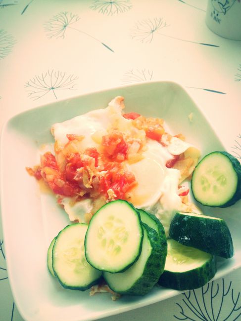 Вчера на завтрак была картоха с салатом и индейка, которая не попала в кадр. На сегодня готовлю шакшуку