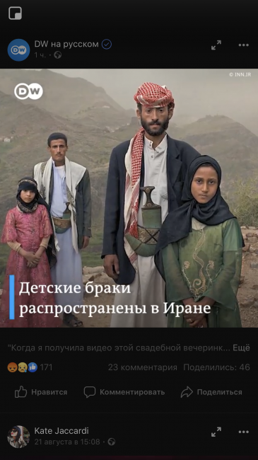 "Когда я получила видео этой свадебной вечеринки, я заплакала. Но в то же время я подумала, что могу что-то сделать, если распространю эту информацию", - говорит Масих Алинежад из Ирана. Видеоролик, показывающий свадьбу взрослого мужчины и 10-летней девочки, вызвал возмущение в соцсетях. Теперь власти Ирана хотят привлечь к ответственности... активистку. За публикацию видео.