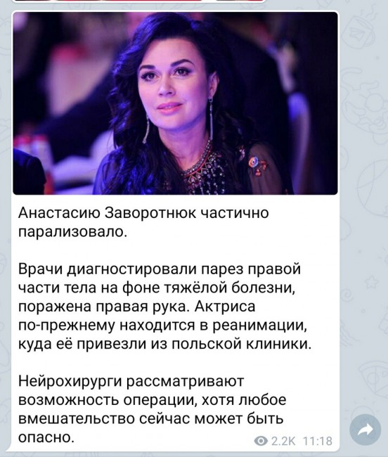 Сегодня стало известно, что звезду ’Моей прекрасной няни’ ввели в медикаментозную кому. Врачи также диагностировали актрисе парез правой части тела на фоне тяжелой болезни. Телеграм-канал Mash сообщает, что у Заворотнюк поражена правая рука.