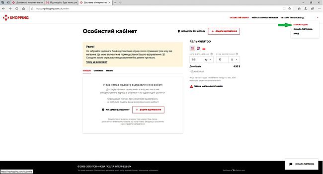 6. Вы перейдете в свой кабинет NPshopping, где есть калькулятор (выбираете одну из трех стран), который примерно сориентирует Вас по стоимости доставки, в т.ч. с учетом оплаты пошлины при превышении лимита в 100 евро. Так же здесь есть переход на Ваши адреса доставки в каждой из трех стран (США, Великобритания, Польша), регистрация посылок и переход в настройки своего кабинета в правом верхнем углу.