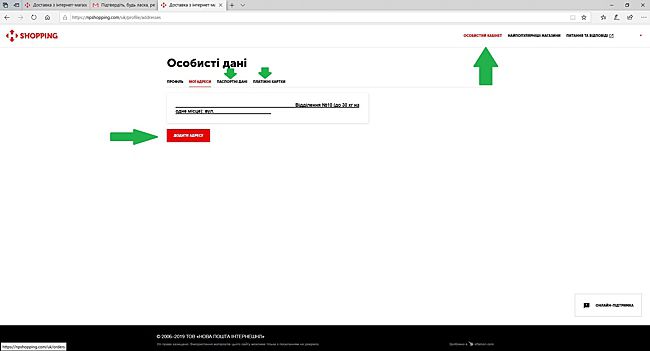 11. При необходимости Вы можете добавить еще адреса доставки, из которых будете потом выбирать при оформлении отправки. Вкладки «Паспортні дані» заполняете по желанию, либо если поступит такой запрос от NPshoping. Вкладу «Платіжні картки» заполняете если планируете сохранить данные карты для дальнейшей оплаты за услуги доставки. Далее переходите в личный кабинет.