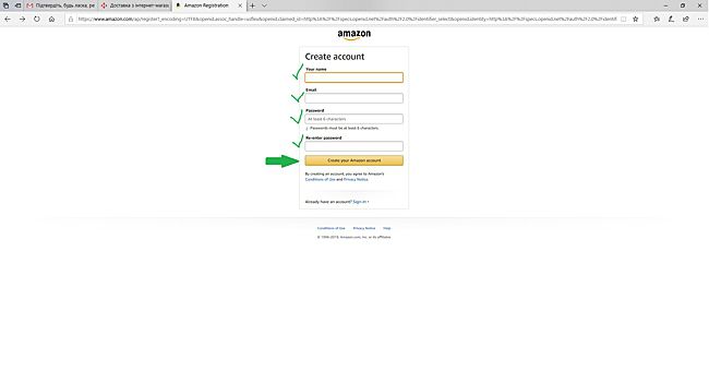2. Заполняем латинскими буквами имя и фамилию, почту и два раза пароль (который Вы придумали), и нажимаем «Create your Amazon account». Если Вы не знаете как правильно написать свои имя и фамилию на английском языке, то перейдите по ссылке