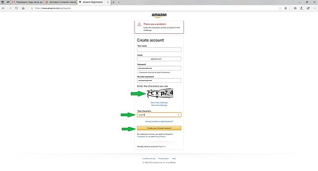 3. Может выскочить проверка на бота. Необходимо цифры и числа с картинки ввести в строке, при необходимости опять ввести имя, почту и пароль (который Вы придумали) два раза и нажимаем «Create your Amazon account»