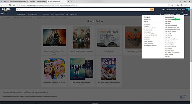 5. Вы создали аккаунт, теперь переходим в настройки. Наводим указателем на «Account & Lists» и в выпадающем меню нажимаем на «Your Account»
