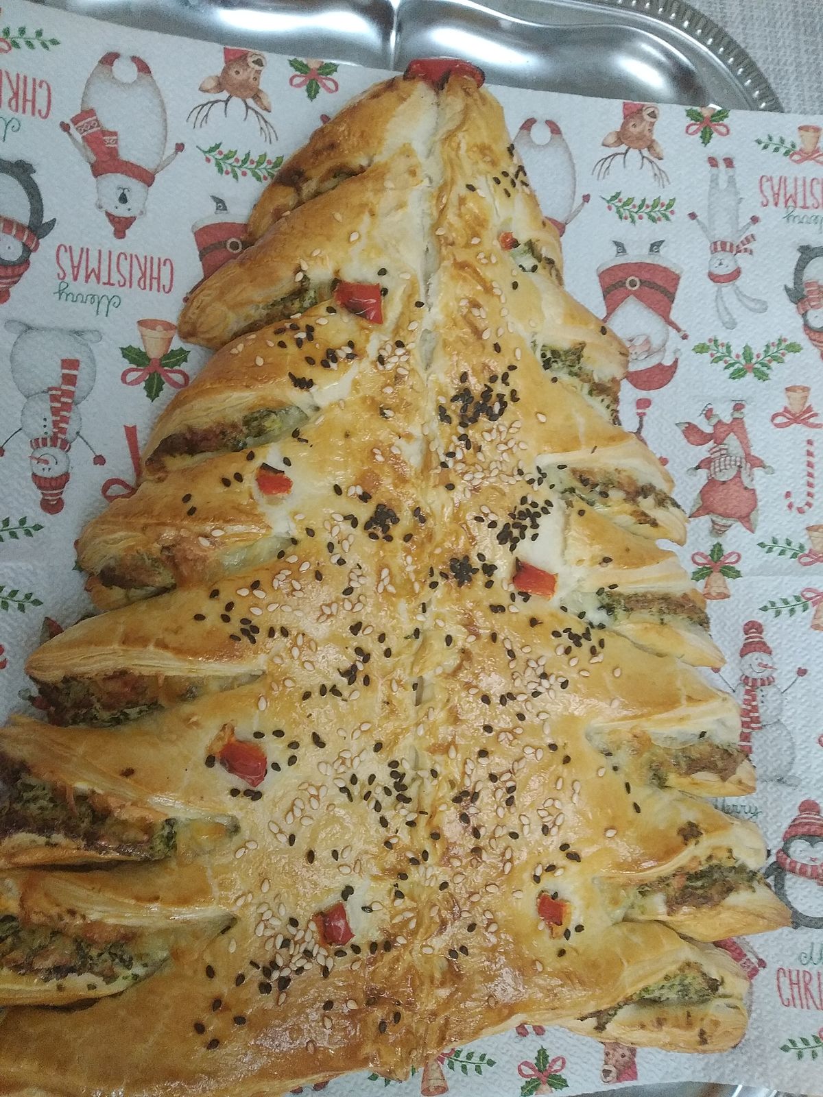 Купите слоёного теста, сделайте ёлочку, начинка творог ( посолить) или брынза, шпинат ( я брала замороженный), и тертый сыр твердый.