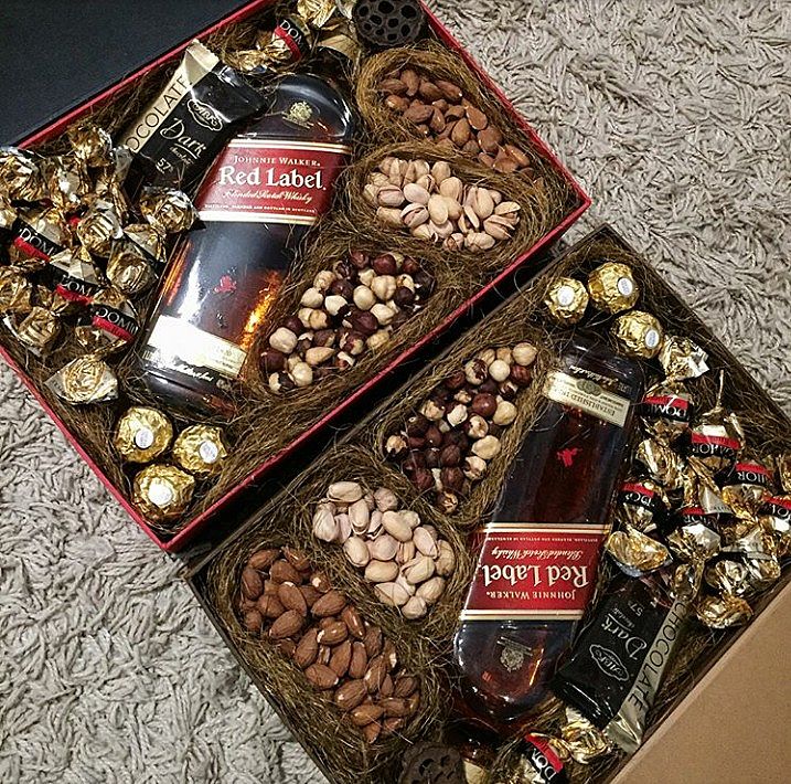 Можно такое. Мы своим как то дарили на дни рождения, коробку, только вместо спиртного цветы и ручка подарочная. Вариантов масса, что туда положить