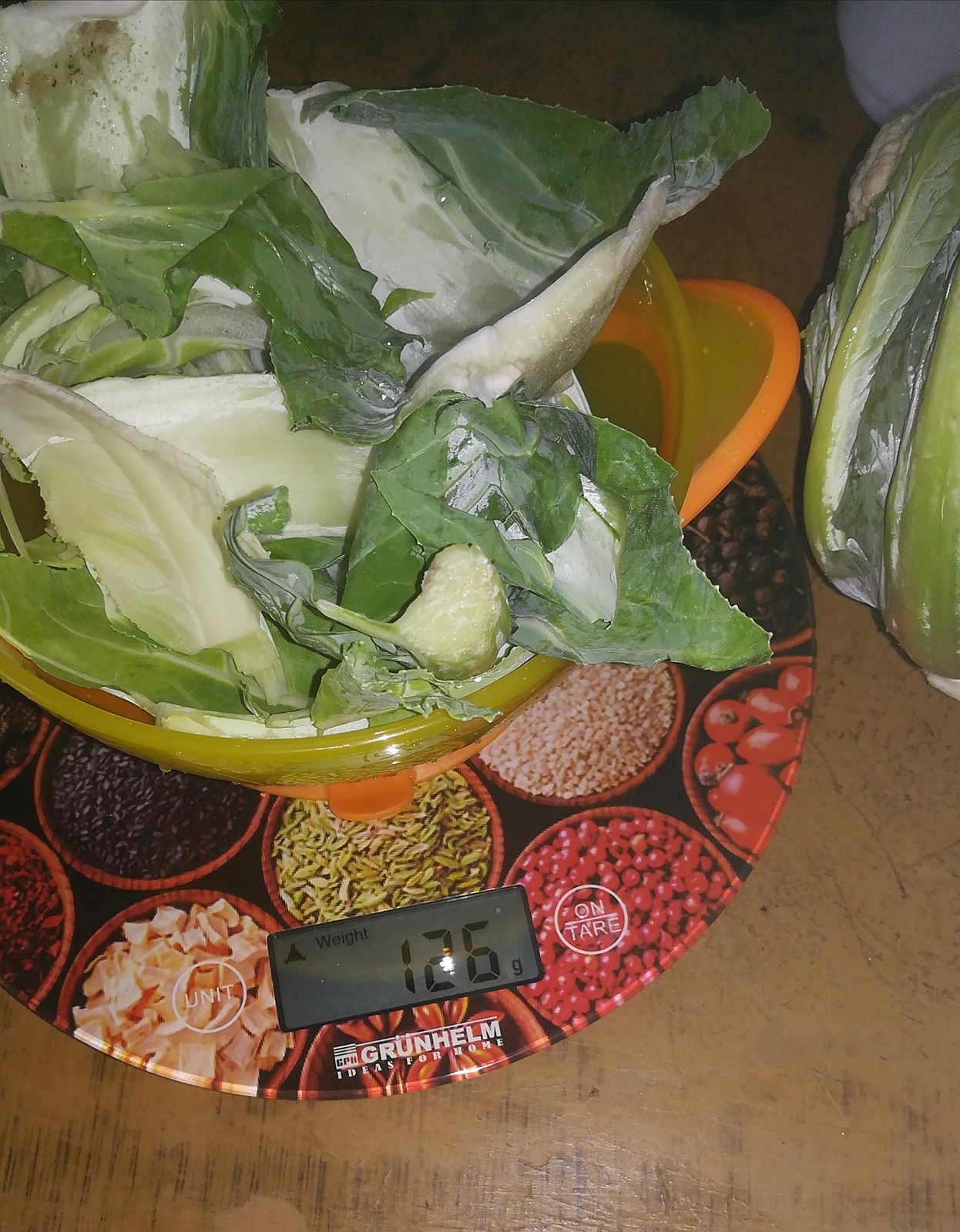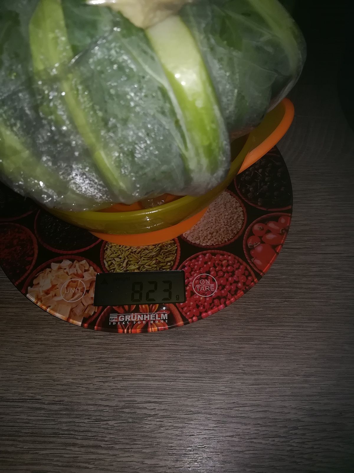 Вот купила по 100грн. за кг заплатила 95 гривен! Значит должно быть 950гр. Пришла домой взвесила, еще листья убрала...По факту капусты грамм 600.