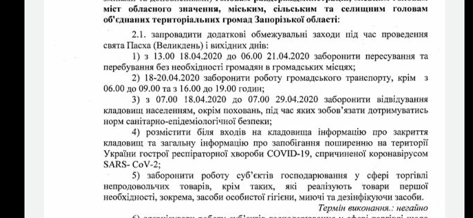 Крім того, мають бути закриті всі підприємства та установи, магазини (в тому числі й продуктові).