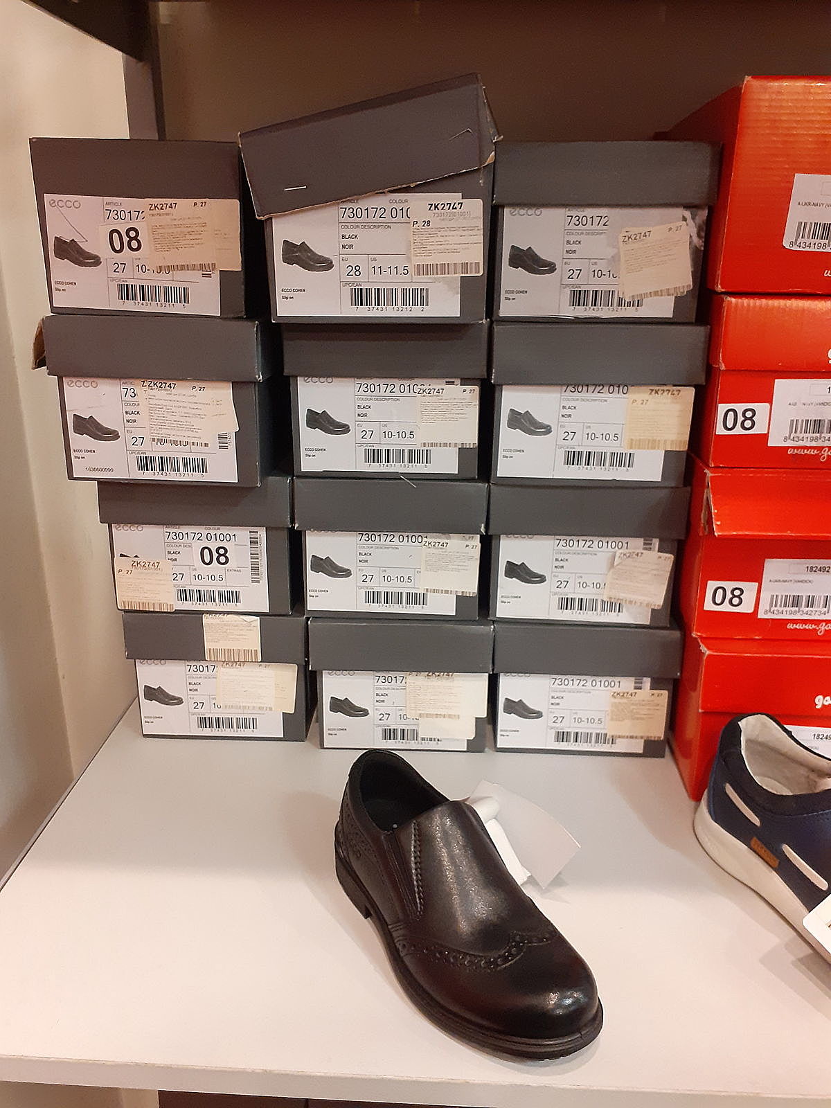Вот например детская модель ECCO COHEN выпускается уже лет 15 наверное, слегка меняют дизайн (то строчка стала фигурней, могут липучку сделать, а могут шнурки). В нашем аутлете (девочки кидали фото) они стоят Р.27,28 - 239 грн, а в английском аутлете они 70 фунтов