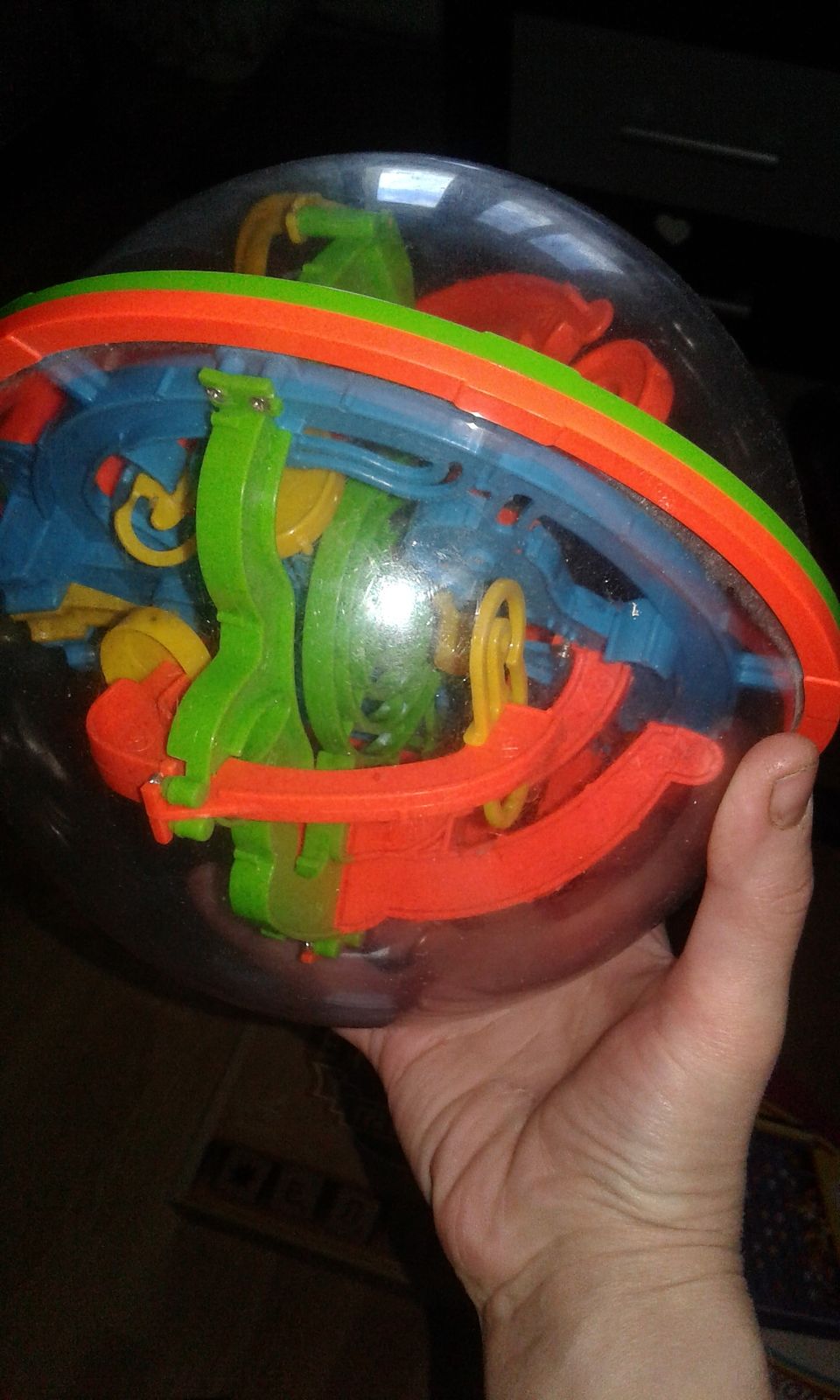 Можете, пожалуйста, рассказать, что нужно делать с фото 4? Нам подарили такое же, мы собрали этот шар, но какой в нем прикол так и не поняли. Шарик в нём болтается как попало, вылетает постоянно. Может мы как-то неправильно собрали и он должен бегать только по дорожкам?
