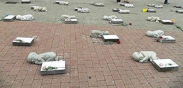 В Минске подобная инсталляция была, женская и детская обувь с подписями Задушена голыми руками отца