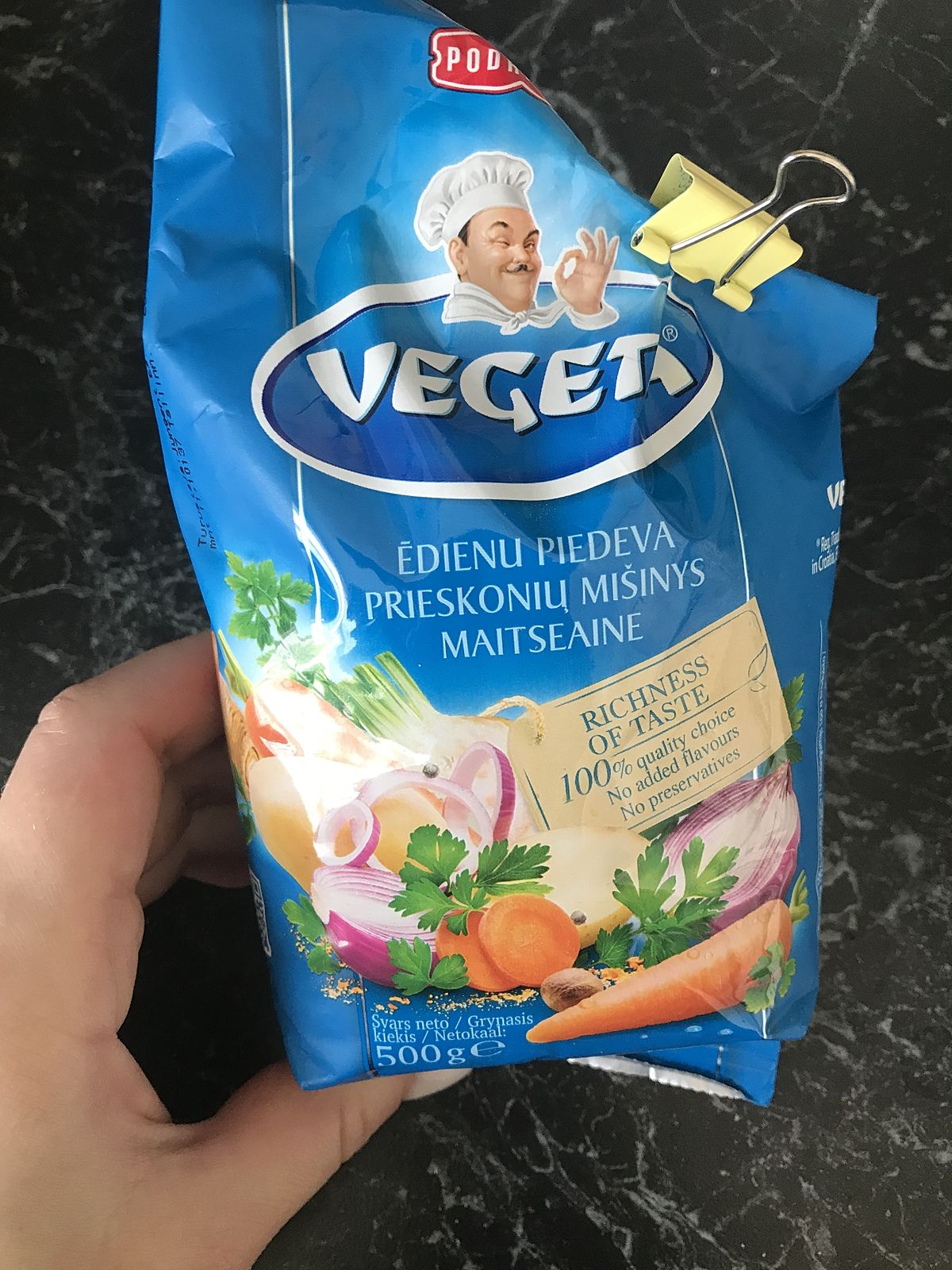 У меня из приправ только лаврушка и черный перец. Остальное - свежие и замороженные овощи, зелень. А в этих приправах глютаматы