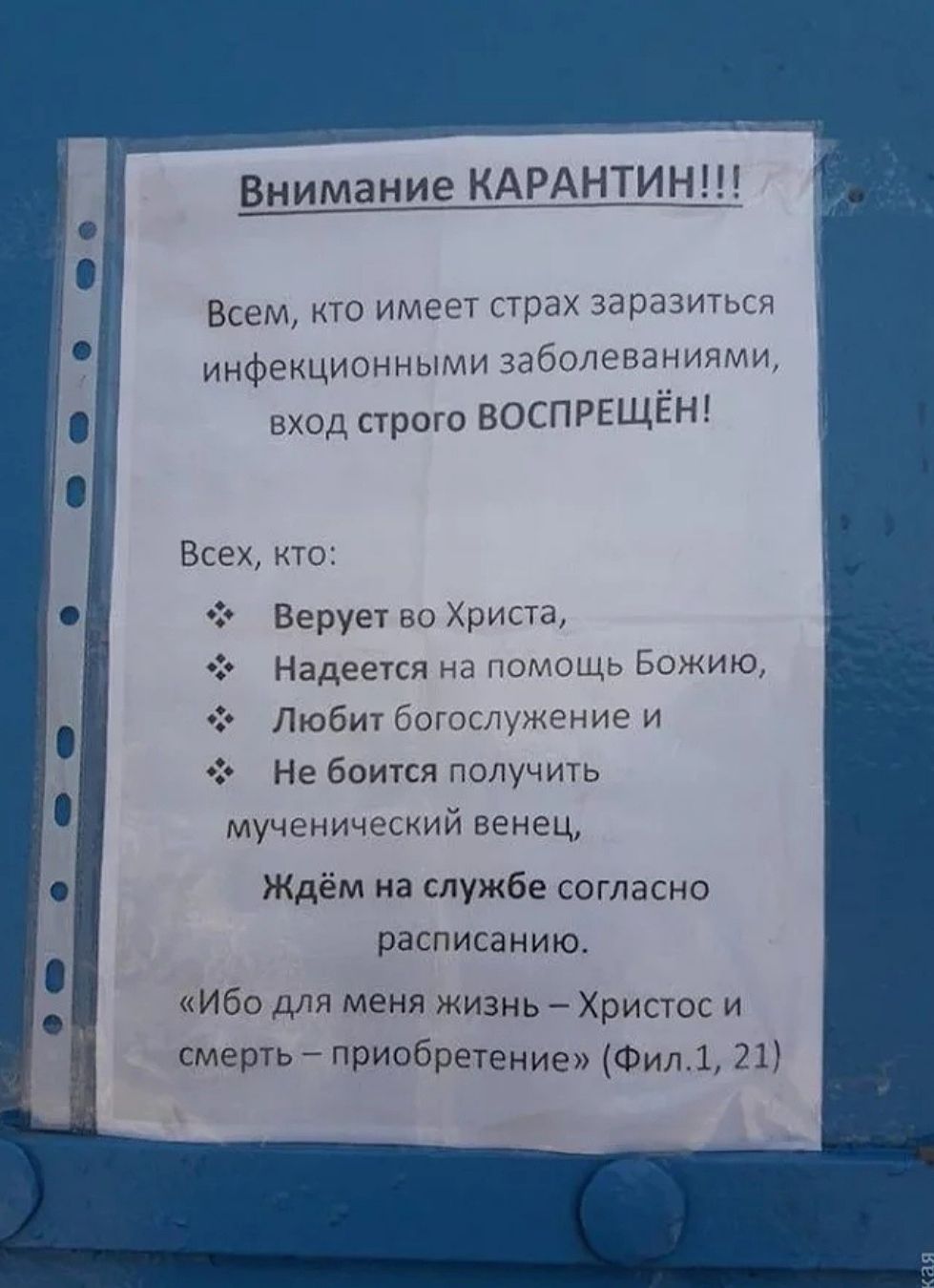 Так что церковь не виновата. Виноваты отсутствие ума и совести у некоторых граждан, а так же правительство со своим полумерным карантином.